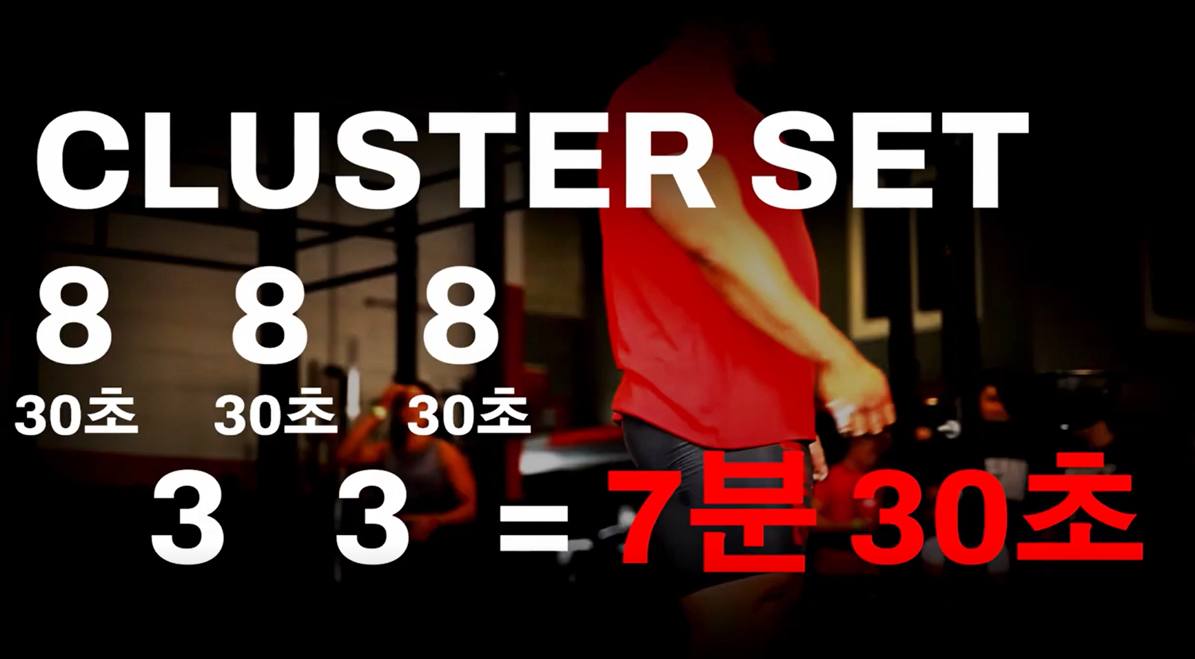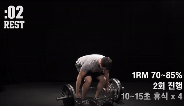클러스터 세트는 일반적으로 12~15회 반복 후에 휴식을 취하는 보디빌딩식 운동법과는 다르게 운동 중간에 짧은 휴식시간을 갖는 것이 특징인 운동법입니다. 최대중량의 약 70~85%의 무게를 사용하여 총 반복 회수8회를 4번에 나눠서 진행을 합니다. 2회 운동을 진행한 후 10~15초 정도 휴식을 취하는 것을 반복 합니다.